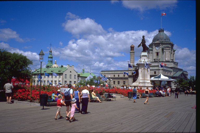 A passeggio sulla terrazza Dufferin, a Québec City, sotto lo sguardo (senza dubbio compiaciuto) di Samuel de Champlain