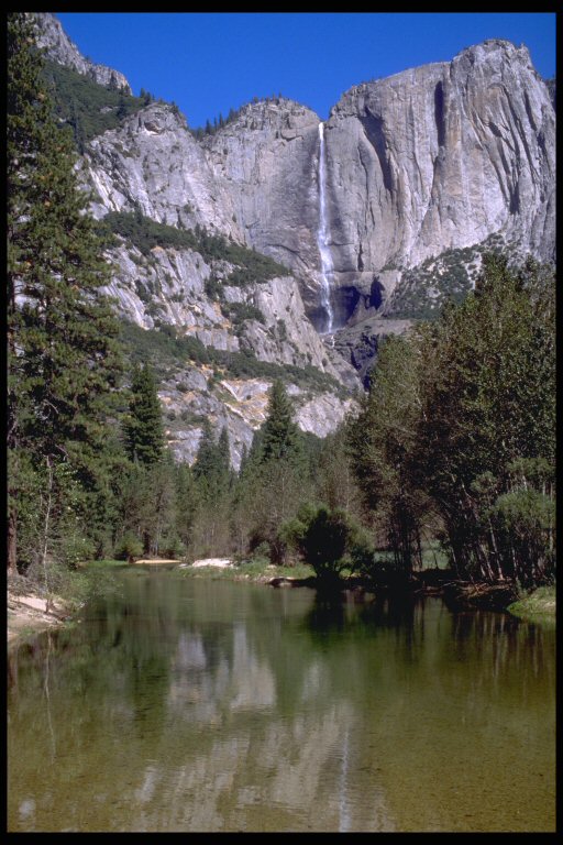 Le Yosemite Falls si specchiano nelle acque del Merced River