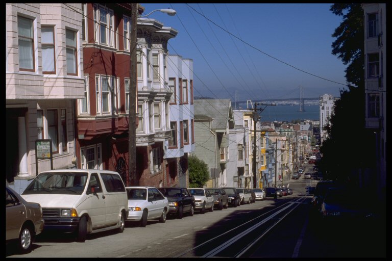 Tipica veduta di una delle ripide strade di San Francisco fiancheggiata da case vittoriane. Sullo sfondo il Bay Bridge.